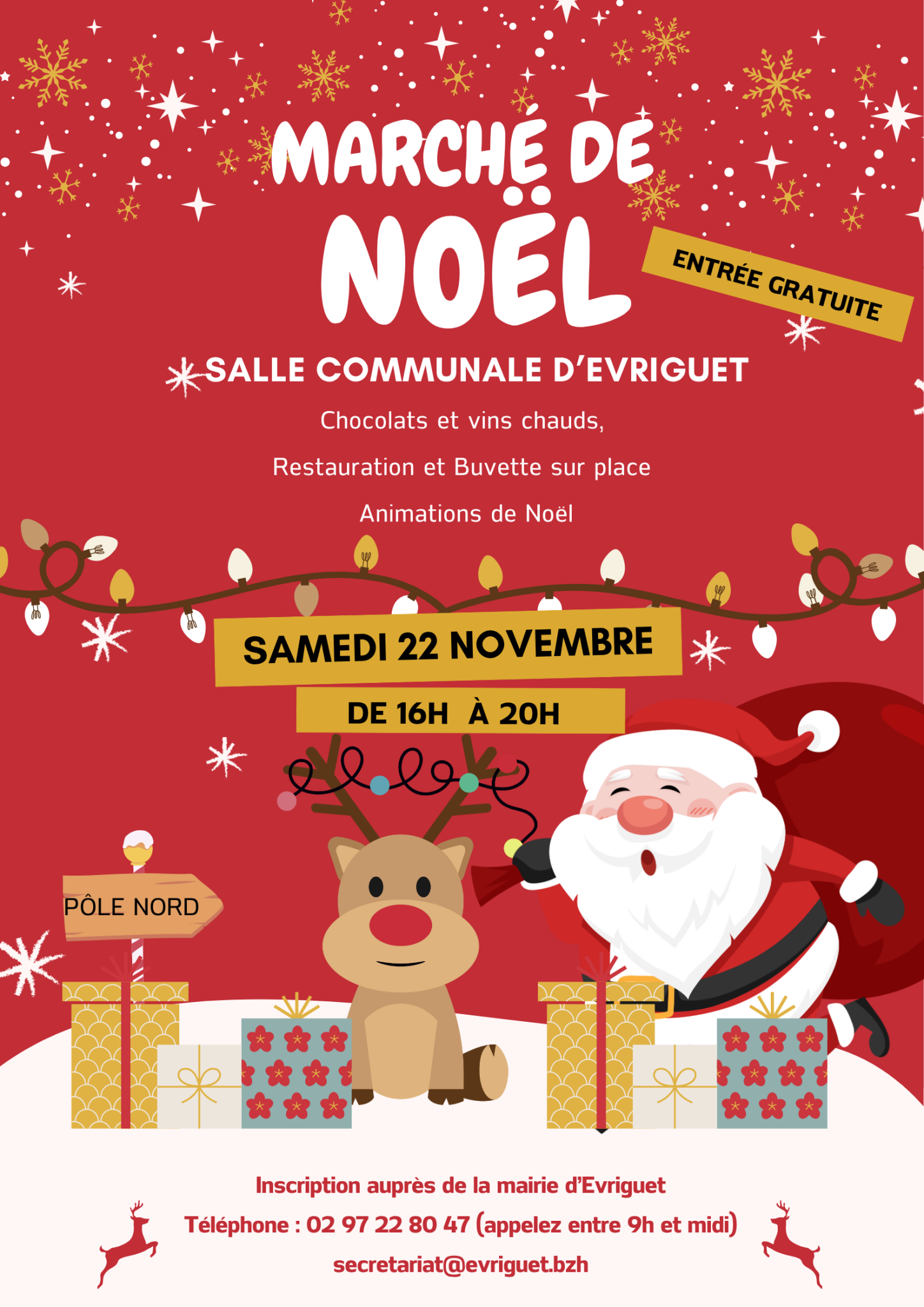 Si vous êtes artisans-commerçants et souhaitez nous rejoindre, soyez le-la bienvenu(e) sur notre marché de Noël. Inscription en mairie (secretariat@evriguet.bzh ou appel entre 9h et midi au 02.97.22.80.47 )